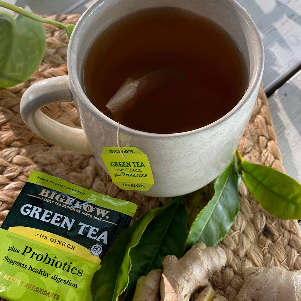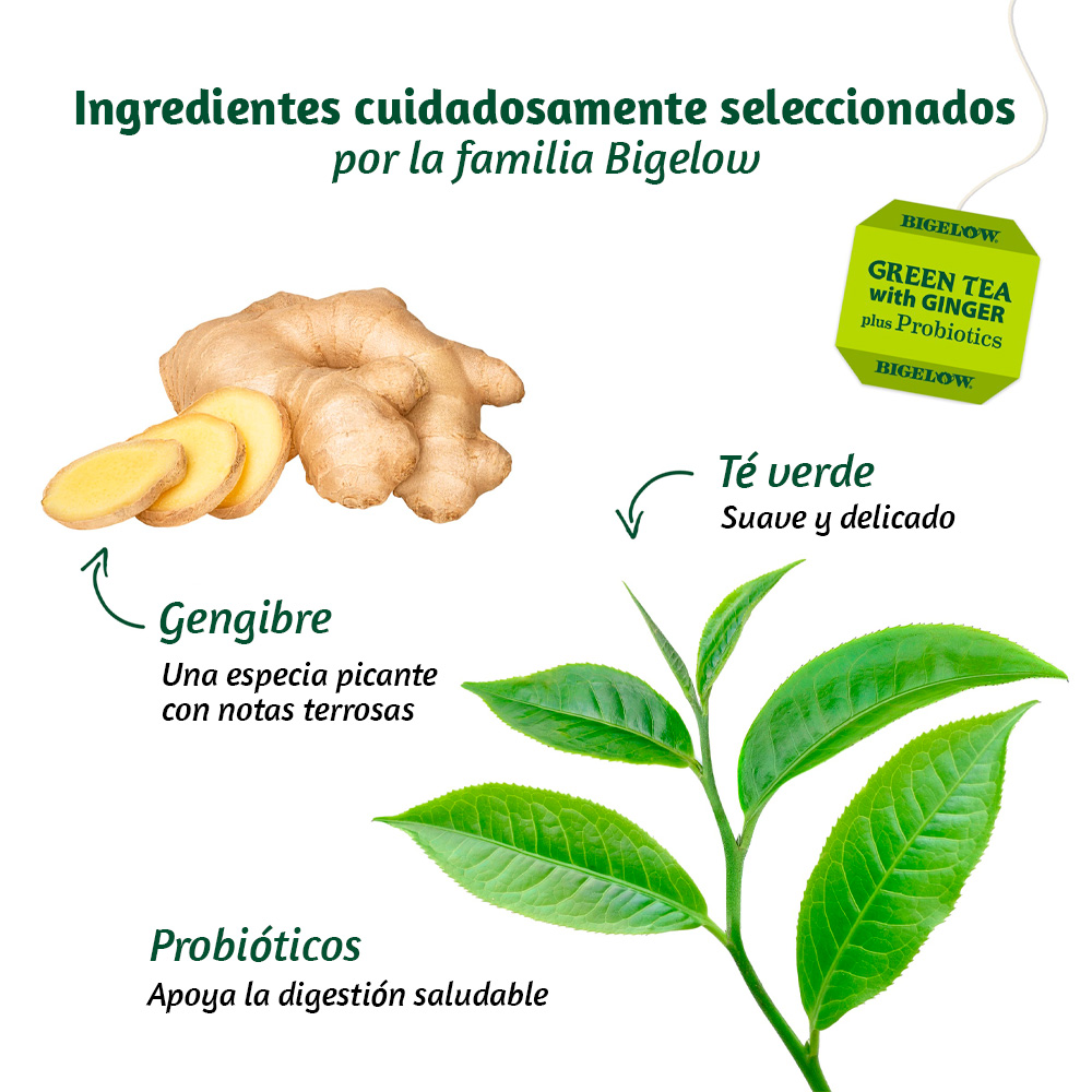 El té verde con jengibre es elaborado con ingredientes cuidadosamente seleccionados por la familia Bigelow: té verde suave y delicado, jengibre que le da un toque picante y sabroso y adicionalmente contiene probióticos que ayudan a la digestión. Bigelow es la marca líder de té premium en Estados Unidos. Nuestro té verde con jengibre contiene probióticos. Elaborado con ingredientes orgánicos de la mejor calidad y protegidos en bolsa de aluminio, para un sabor, frescura y aroma incomparable Modo de uso Coloque una bolsa de té en una taza (240 ml) de agua caliente por 2 minutos . Posteriormente retire la bolsa sin exprimir y disfrute su delicioso té verde con jengibre y probiótico