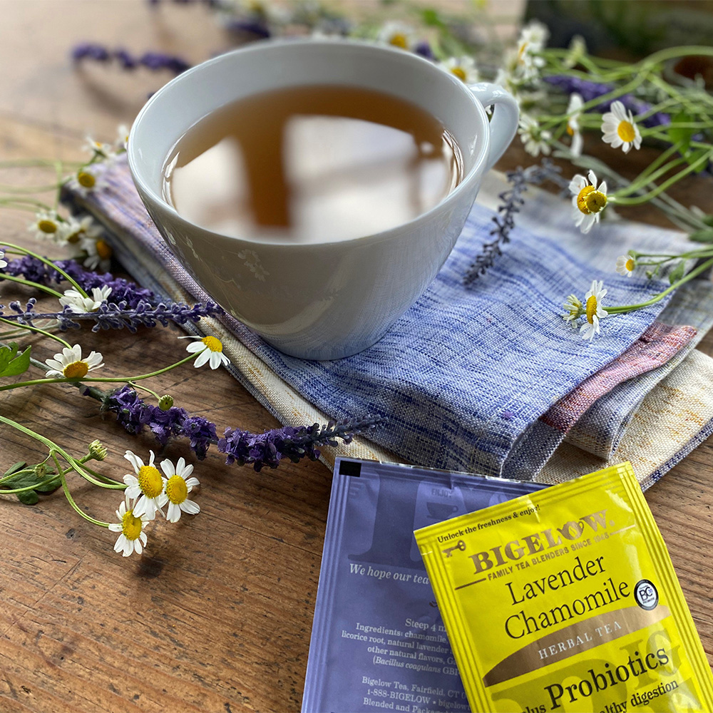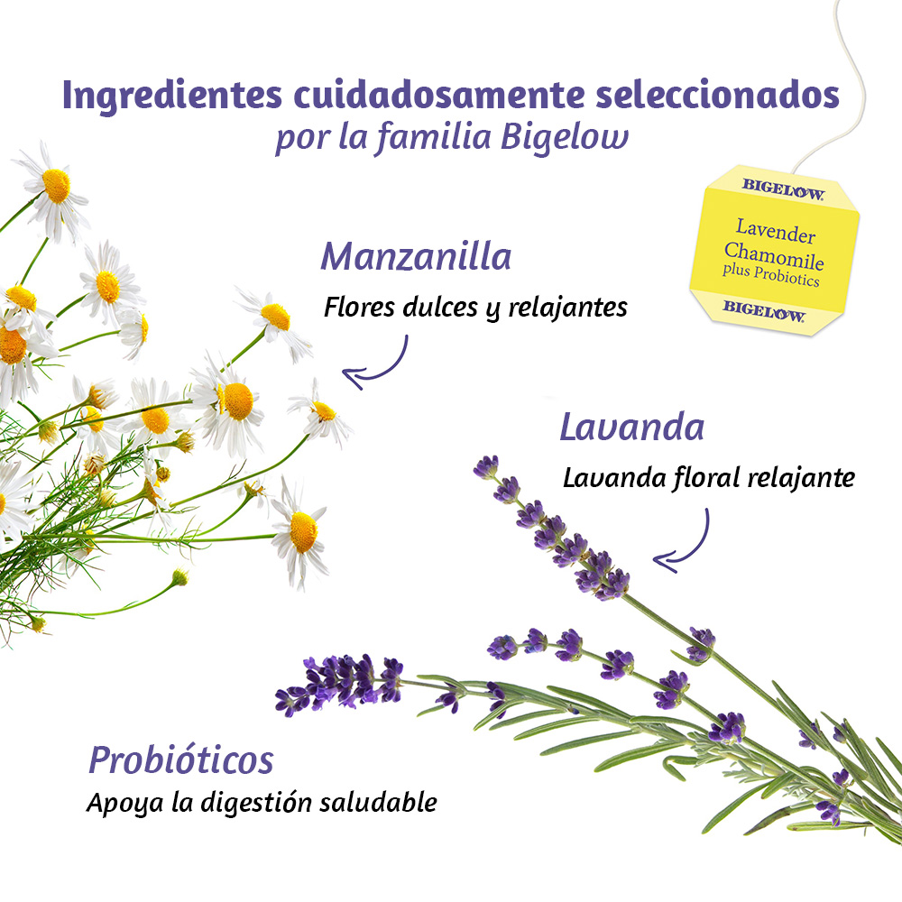El té de manzanilla y lavanda es elaborada con ingredientes cuidadosamente seleccionados por la familia Bigelow: flores dulces y relajantes de manzanilla y lavanda. Adicionalmente contiene probióticos que ayudan a la digestión. Bigelow es la marca líder de té premium en Estados Unidos. Nuestra manzanilla con lavanda contiene probióticos. Elaborado con ingredientes orgánicos de la mejor calidad y protegidos en bolsa de aluminio, para un sabor, frescura y aroma incomparable Modo de uso Coloque una bolsa con té en una taza (240 ml) con agua caliente por 4 minutos . Posteriormente retire la bolsa sin exprimir y disfrute su deliciosa infusión de manzanilla con lavanda y probióticos