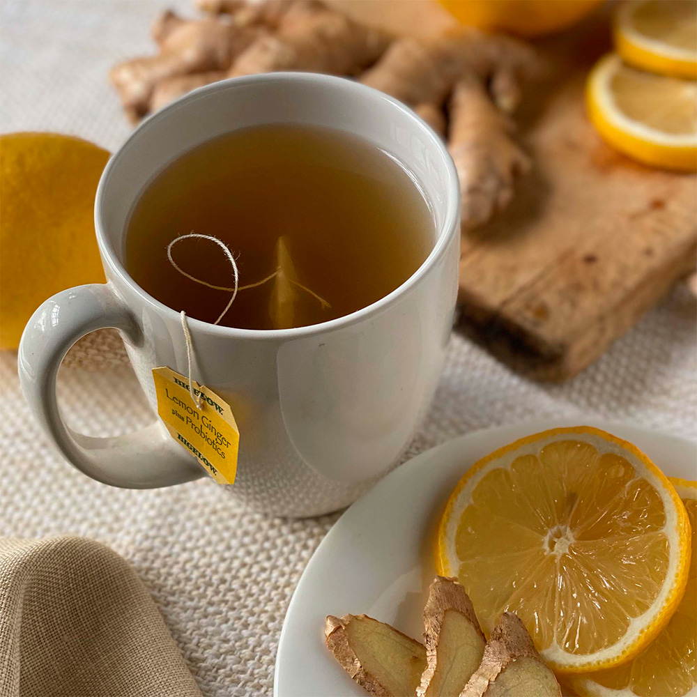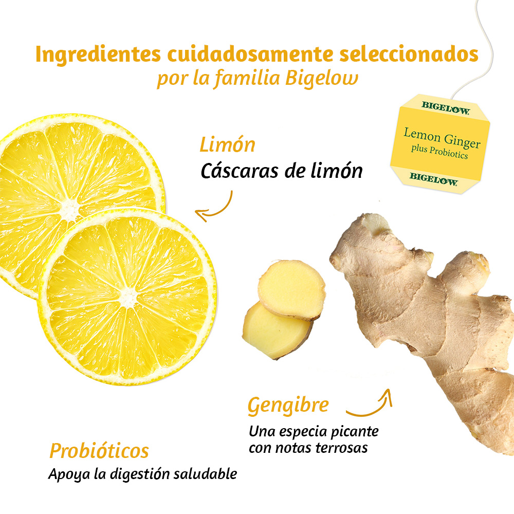 El té de limón con jengibre y probióticos es elaborado con ingredientes cuidadosamente seleccionados por la familia Bigelow: limón fresco, jengibre que le da un toque picante y sabroso. Adicionalmente contiene probióticos que ayuda a la digestión Bigelow es la marca líder de té premium en Estados Unidos. Nuestro té de limón y jengibre contiene probióticos. Elaborado con ingredientes orgánicos de la mejor calidad y protegidos en bolsa de aluminio, para un sabor, frescura y aroma incomparable Modo de uso Coloque una bolsa con té en una taza (240 ml) con agua caliente por 4 minutos . Posteriormente retire la bolsa sin exprimir y disfrute su deliciosa bebida de limón con jengibre y probióticos