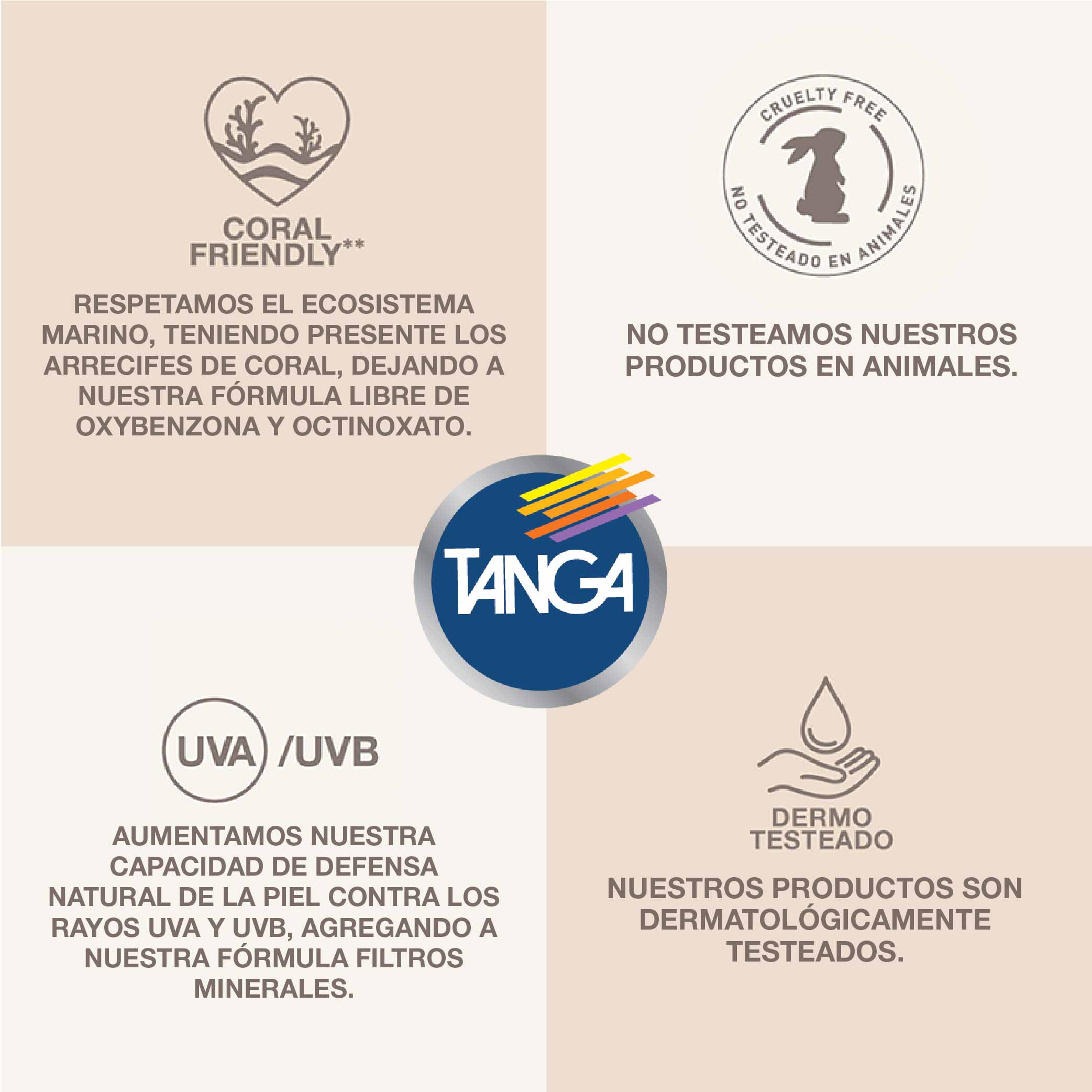 Tanga tiene altos índices de protección ante el amplio espectro de las radiaciones UVB, UVA, luz infrarroja y luz azul. Respetamos los corales con fórmulas sin Oxybenzona y Octinoxate, brindando el mejor cuidado comprometidos con el ambiente.