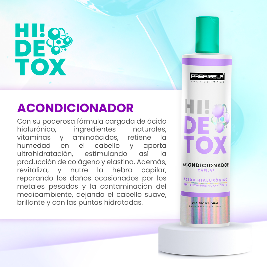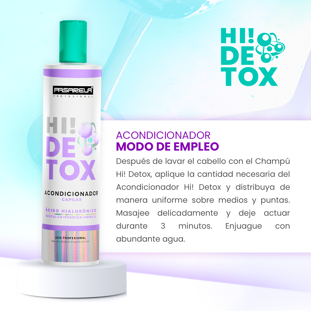 ACONDICIONADOR HI DETOX PASARELA PROFESIONAL 300 ML Su poderosa fórmula cargada de ácido hialurónico, ingredientes naturales, vitaminas y aminoácidos, retiene la humedad en el cabello y aporta ultra hidratación, estimulando así la producción de colágeno y elastina. Modo de uso Después de lavar el cabello con el Champú Hi! Detox, aplique la cantidad necesaria del Acondicionador Hi! Detox y distribuya de manera uniforme sobre medios y puntas. Masajee delicadamente y deje actuar durante 3 minutos. Enjuague con abundante a