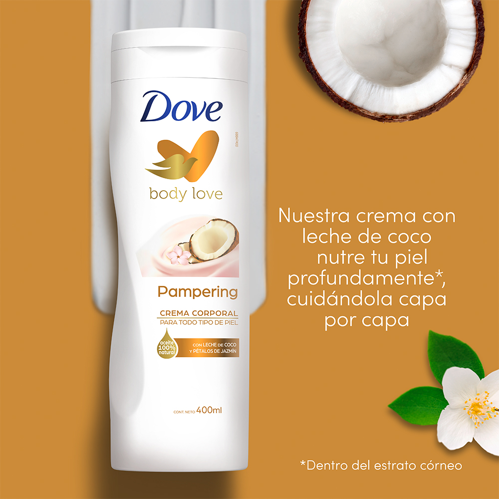 Crema Corporal Dove Body Love Pampering 400ml Cuidado para todo tipo de piel con frafancia indullgente e ingredientes que humectan la piel hasta por 24 horas. Crema corporal Dove Body love Coco 400 ml Modo de uso La aplicación es sencilla: úsala diariamente en todo tu cuerpo y disfruta de su agradable fragancia que te envolverá en una sensación de bienestar.