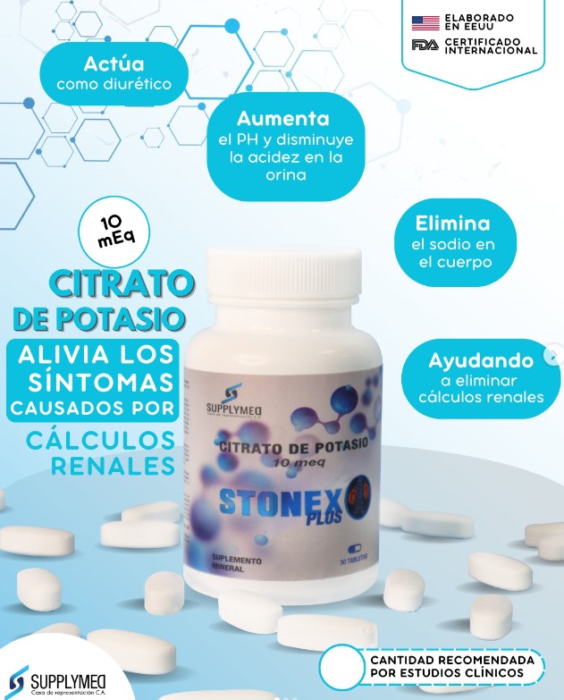 El Citrato de Potasio es un suplemento mineral, que contribuye a la eliminación de cálculos renales, coadyuvante en el aumento del PH de la orina, es el perfecto alcalinizante de la orina en pacientes con litiasis renal. El Citrato de Potasio es un suplemento mineral, que contribuye a la eliminación de cálculos renales, coadyuvante en el aumento del PH de la orina, es el perfecto alcalinizante de la orina en pacientes con litiasis renal. Modo de uso En pacientes con hipocitraturia severa, iniciar el tratamiento a la dosis de 6 tabletas por día, repetidos en 3 tomas al día. En hipocitraturia leve iniciar con 3 tabletas al día.