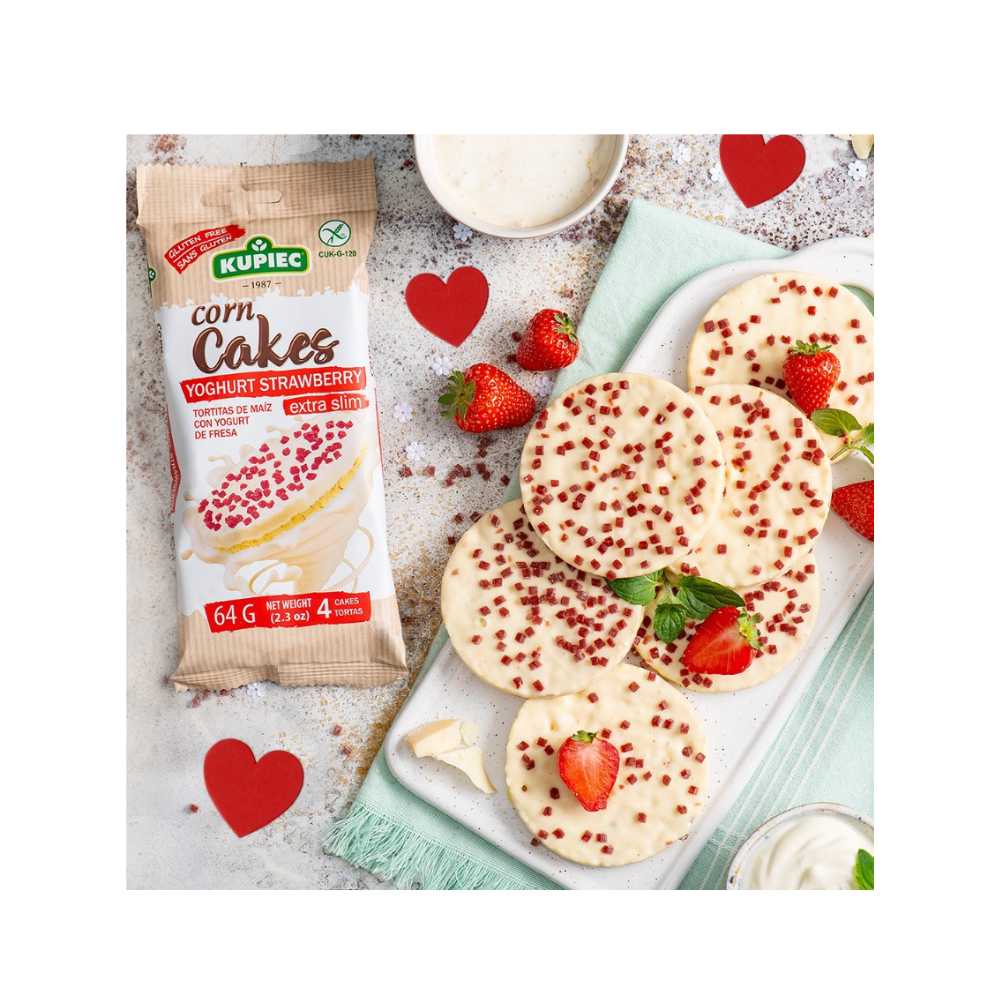 Son una opción perfecta para quienes siguen una dieta sin gluten. Gracias a la combinación excepcional de maíz ligeramente sin azúcar con el dulzor de los sabores de la infancia en forma de cobertura de yogur con trocitos de fresa.