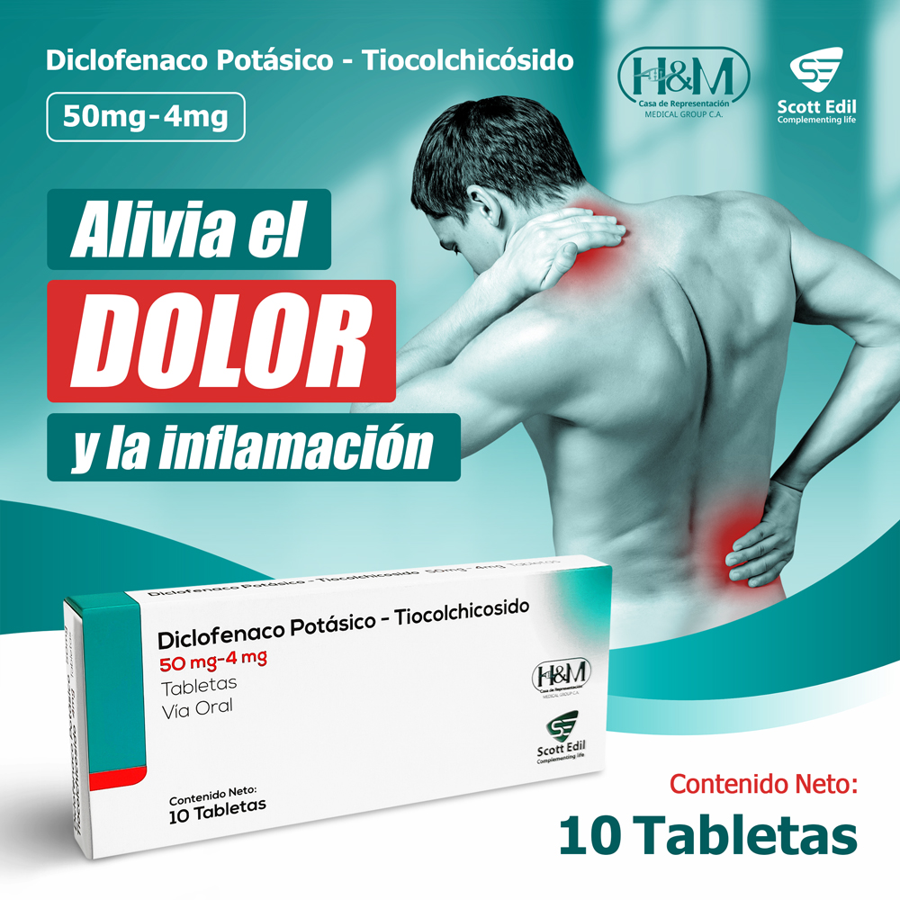 Relajante muscular en combinación fija con un AINE no selectivo que coadyuva en el control del dolor y la inflamación. Diclofenaco Potásico 50 Mg - Tiocolchicosido 4 Mg x 10 Tabletas Vía Oral H&M Modo de uso N/A