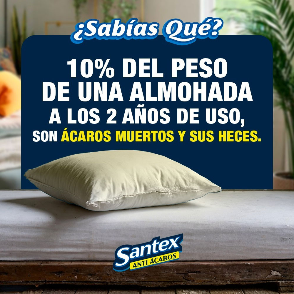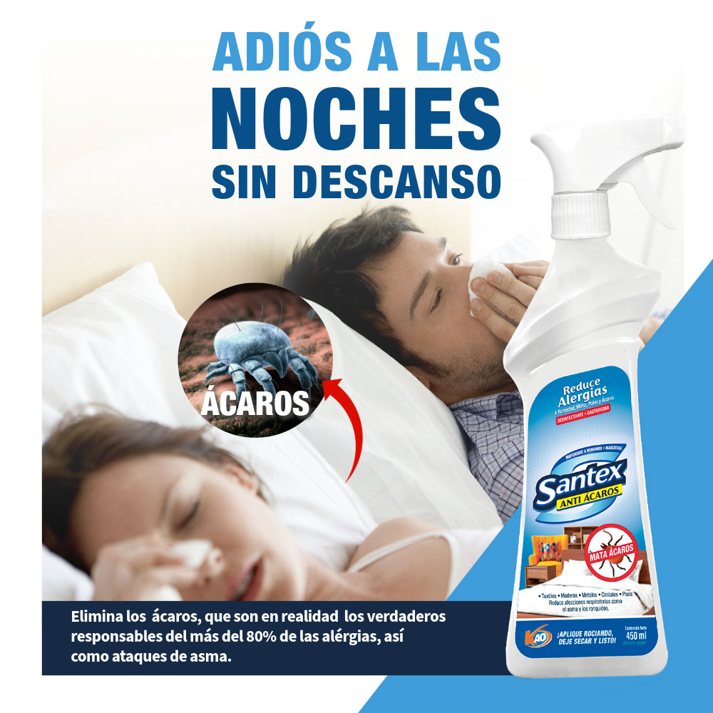 Uno de los principales causantes de las alergias nocturnas son los ácaros del polvo, insectos microscópicos similares a las arañas que se alimentan de células exfoliadas de piel humana. Usando Santex puedes disfrutar de un ambiente libre de ácaros.