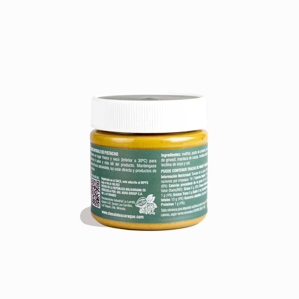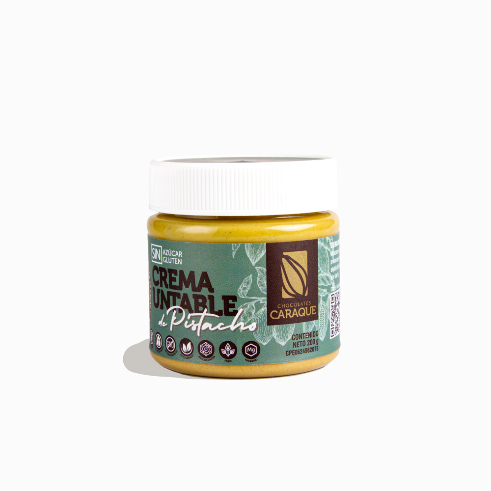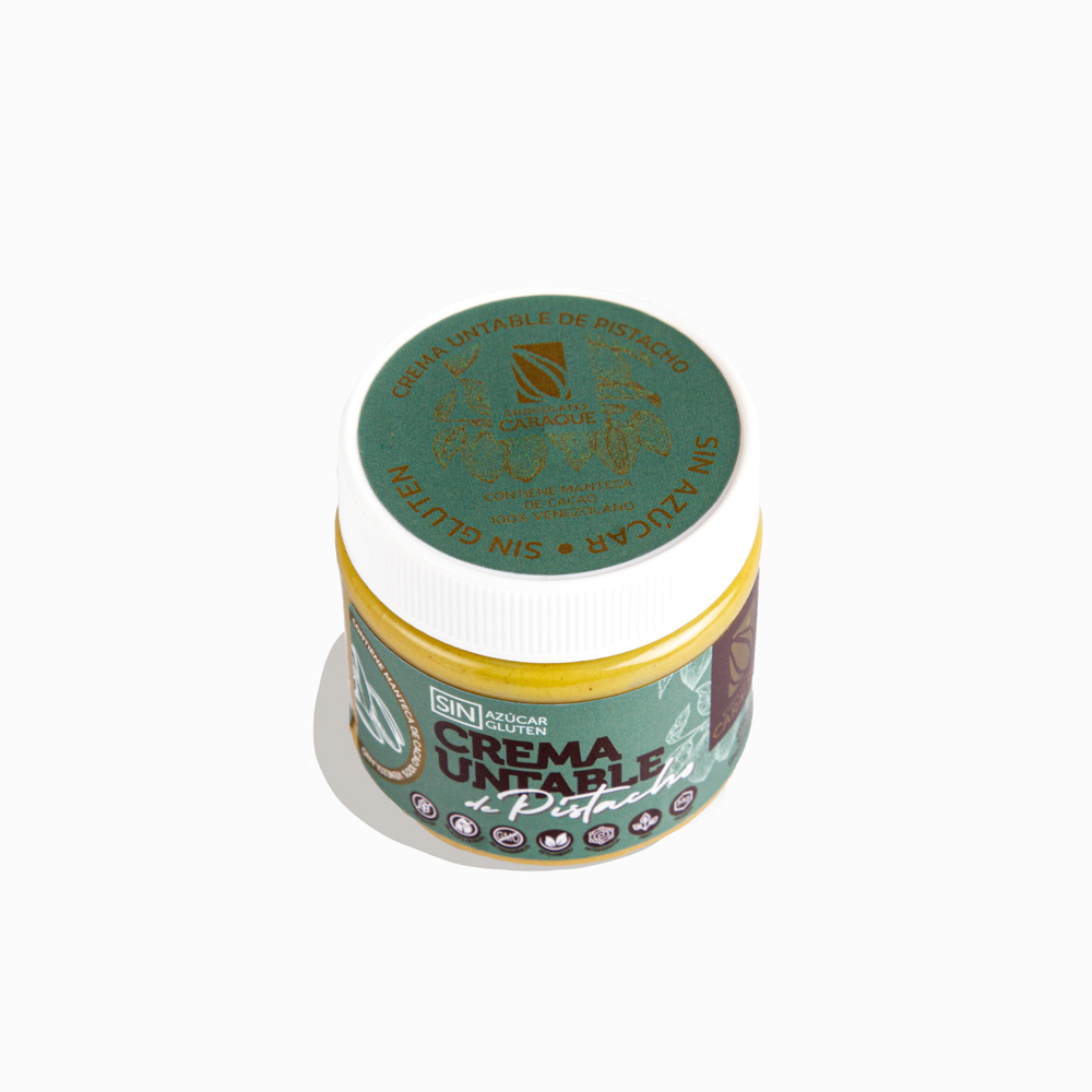 CREMA UNTABLE DE PISTACHO CHOCOLATES CARAQUE 200 GRS Sin Azúcar Sin Gluten 100% Pistacho natural 100% Manteca de Cacao Sin transgénicos, Keto friendly, Con antioxidante. Modo de uso Como acompañante de postres, Repostería saludable Rellenos para dátiles Smoothies y batidos Combinada con helados y frutas Opción ideal para quienes desean reducir su consumo de azucares sin renunciar al sabor autentico