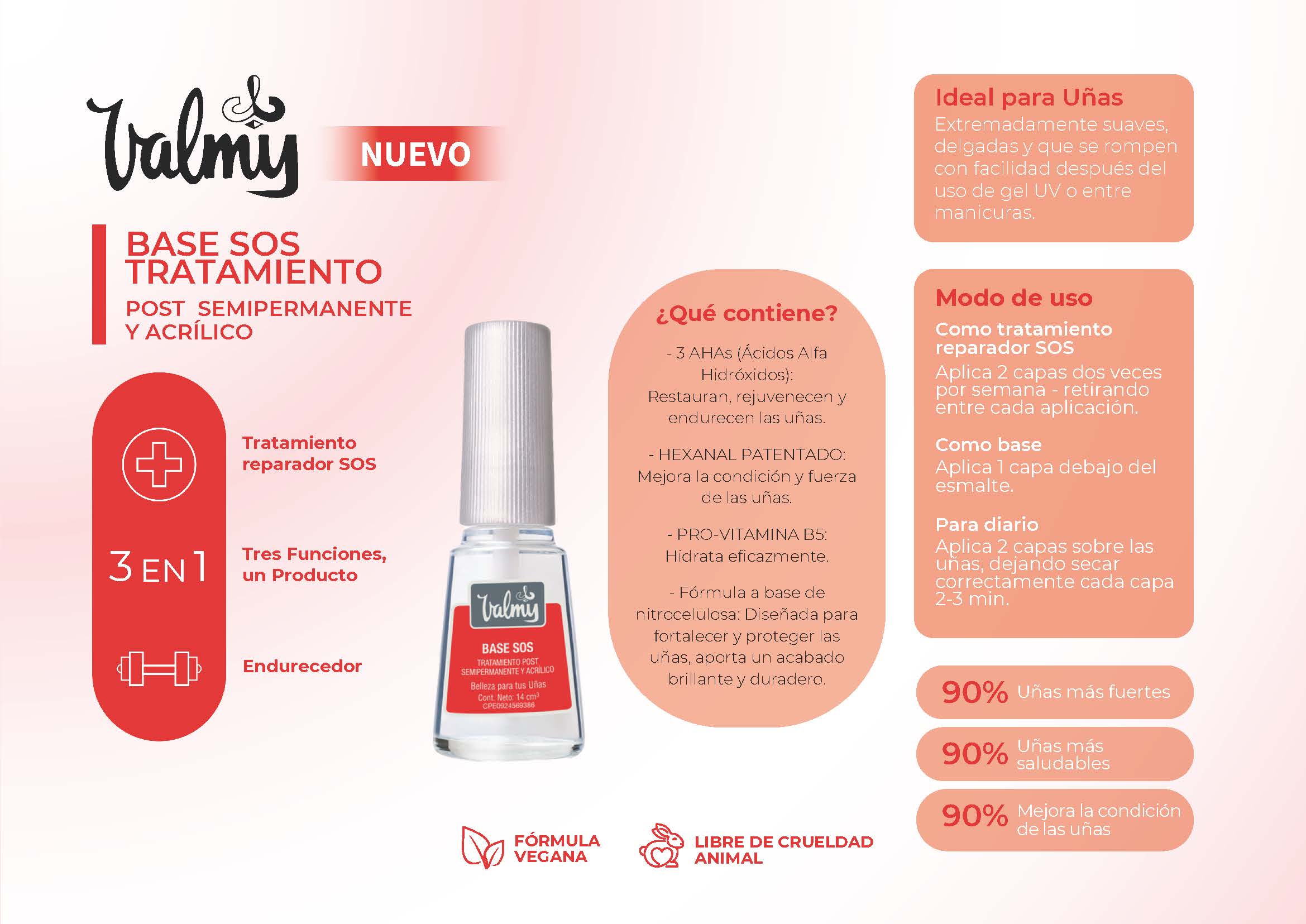BASE SOS TRATAMIENTO POST SEMIPERMANENTE Y ACRÍLICO. Modo de uso: Como tratamiento reparador SOS: Aplica 2 capas dos veces por semana - retirando entre cada aplicación. Como base: Aplica 1 capa debajo del esmalte. Para diario: Aplica 2 capas sobre las uñas, dejando secar correctamente cada capa 2-3 min.