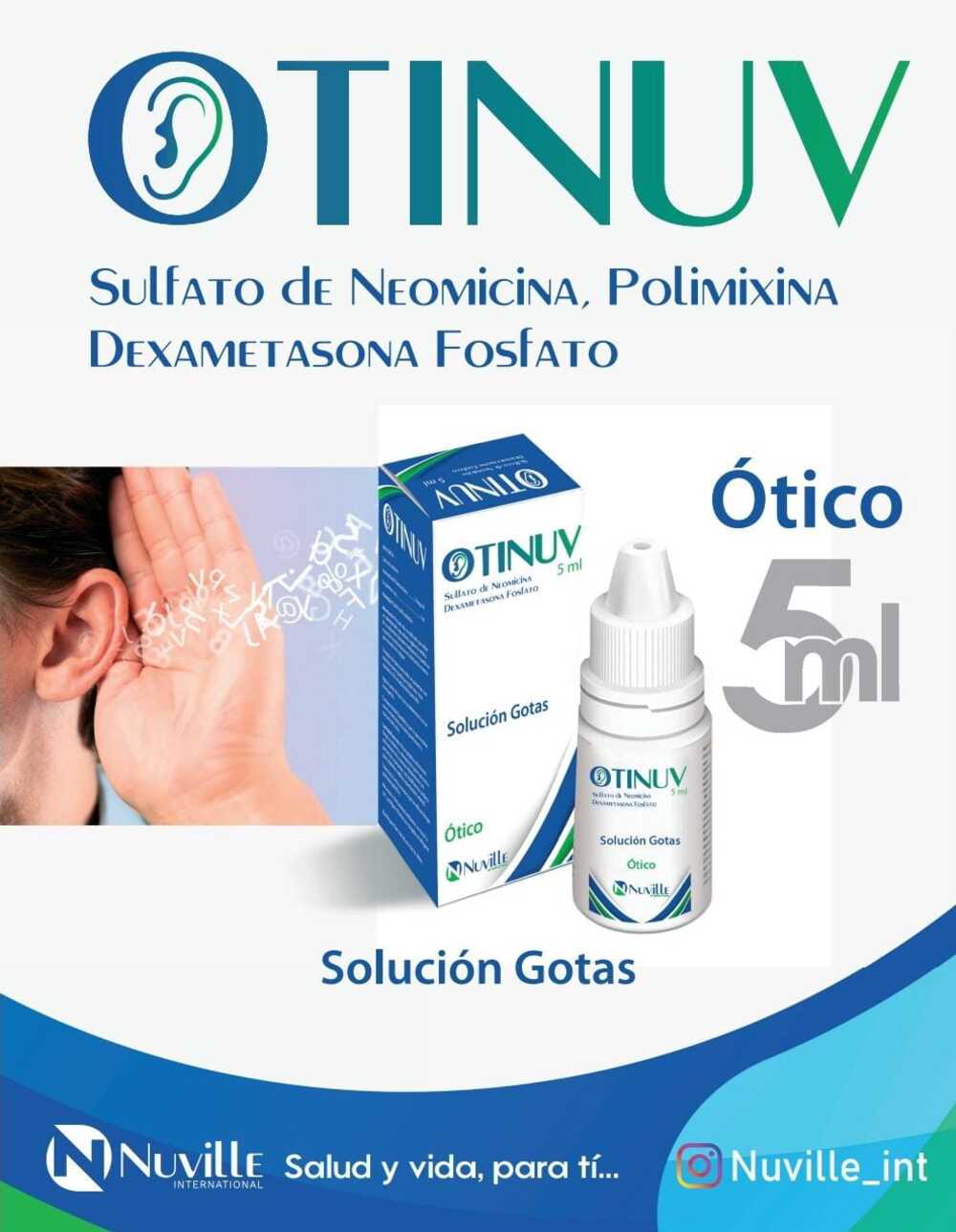 Otinuv 5ml Dexametasona, Polimixina y Neomicina Gotas óticas Nuville Gotas óticas que alivian el dolor, reducen la inflamación y combaten las infecciones del oído. Modo de uso: Vía ótica.