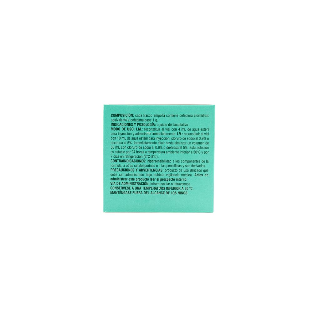 Cada frasco ampolla contiene cefepima clorhidrato equivalente a cefepima base 1g.