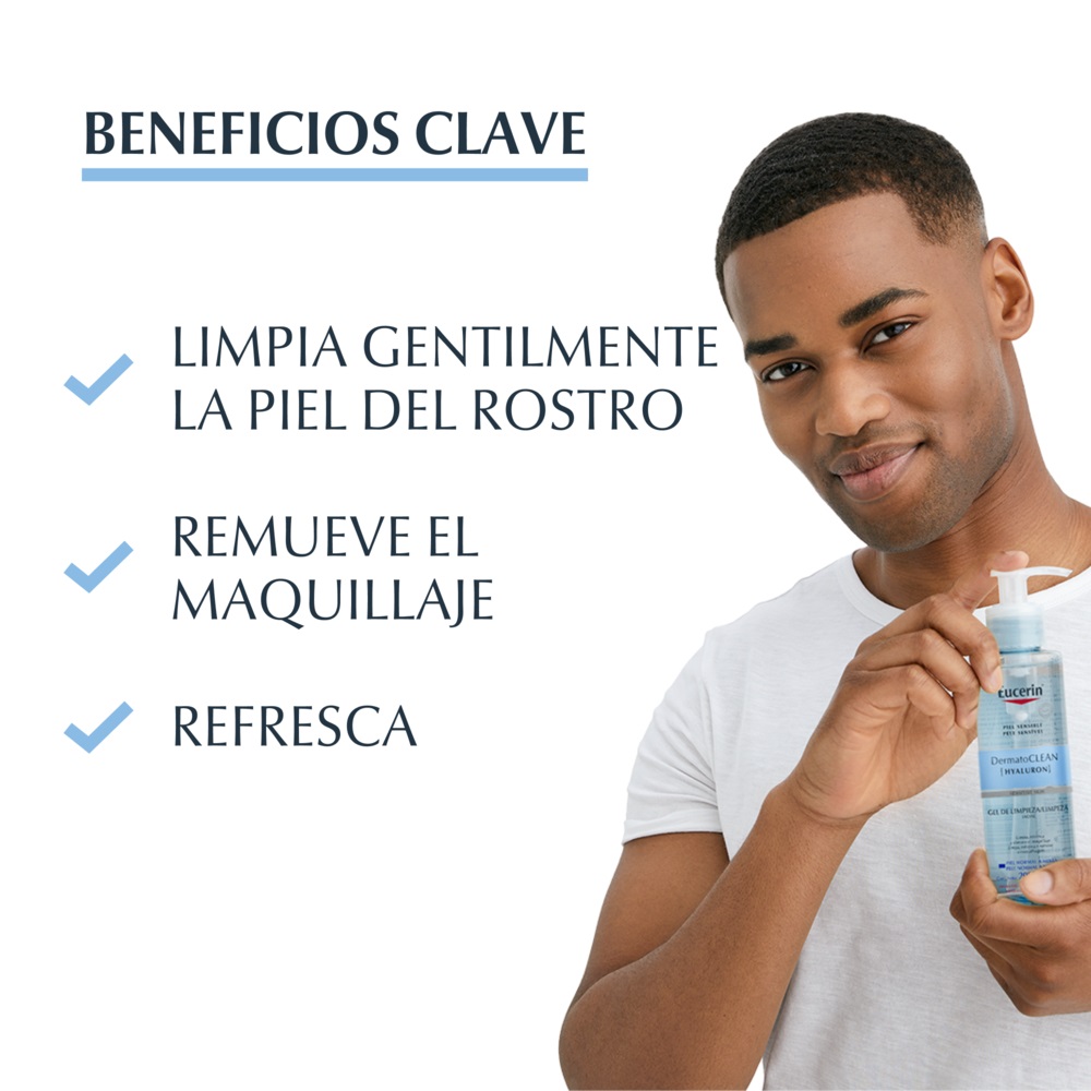 El Gel de Limpieza Facial Eucerin DermatoCLEAN limpia, refresca y elimina el maquillaje.