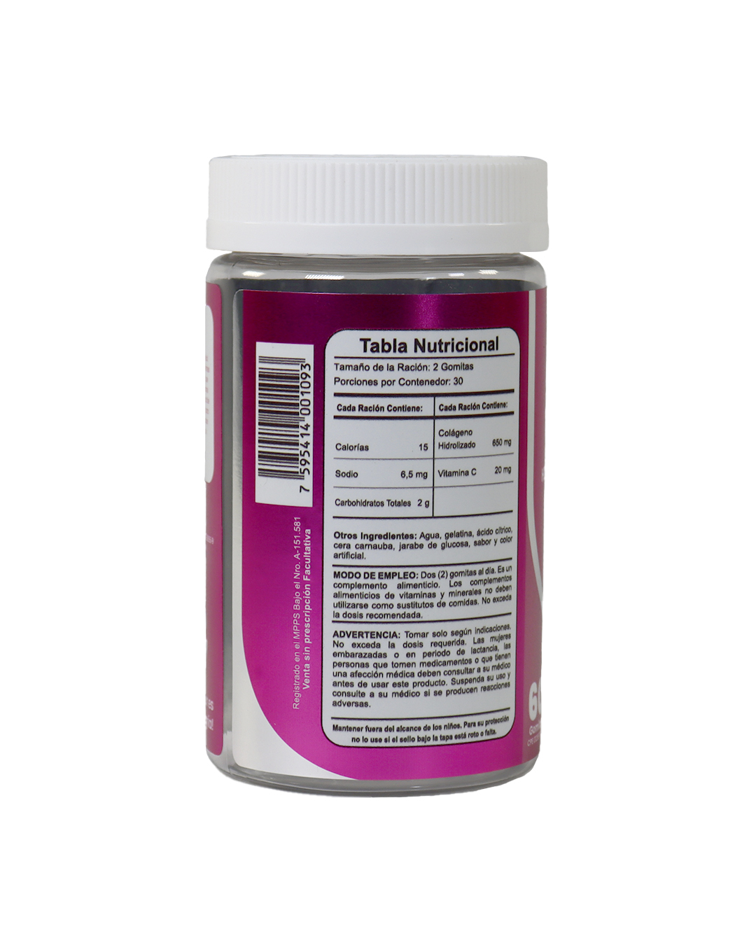 Es una forma de colágeno que se ha descompuesto en péptidos que facilita su absorción. Gomitas masticables con colágeno y vitamina c sabor a parchita. Modo de uso: dos gomitas al día. No exceda la dosis recomendada.