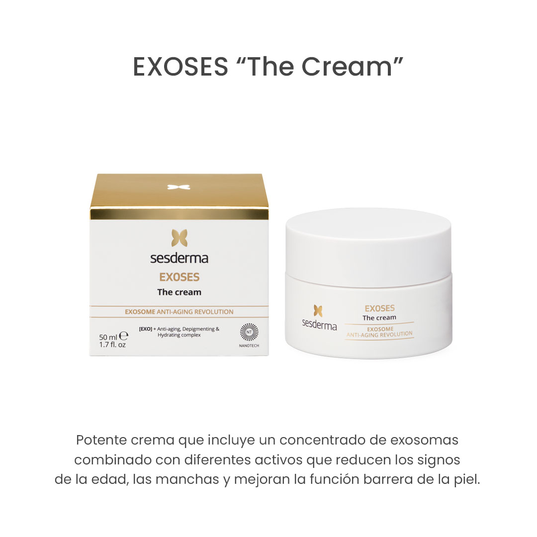 Exoses The Cream es una potente crema que incluye un concentrado de exosomas combinado con diferentes activos que reducen los signos de la edad, las manchas y mejoran la función barrera de la piel. Exoses The Cream es una potente crema que incluye un concentrado de exosomas combinado con diferentes activos que reducen los signos de la edad, las manchas y mejoran la función barrera de la piel. Modo de uso Aplicar por el día o la noche sobre el rostro. Masajear el producto suavemente hasta su completa absorción.