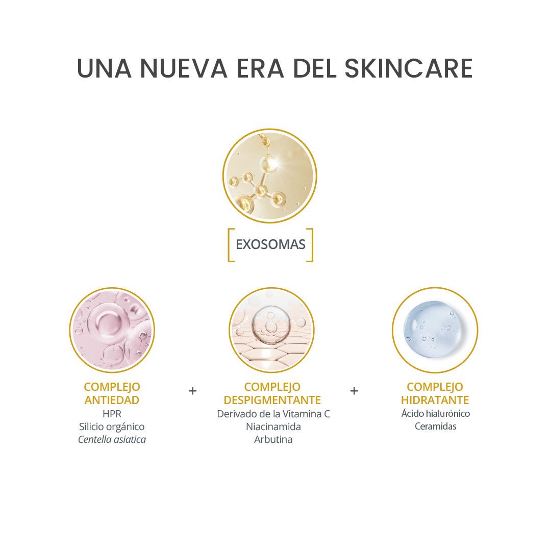 Exoses es la única línea que potencia los beneficios propios de los exosomas junto con un complejo antiedad, un complejo despigmentante y un complejo hidratante para maximizar los resultados.