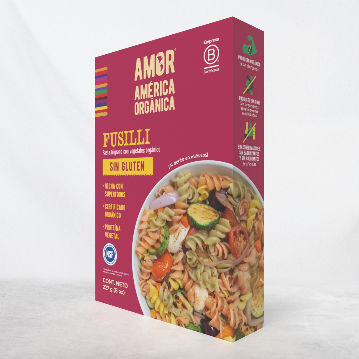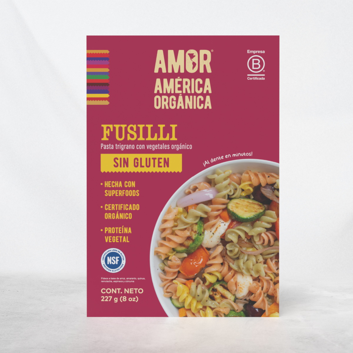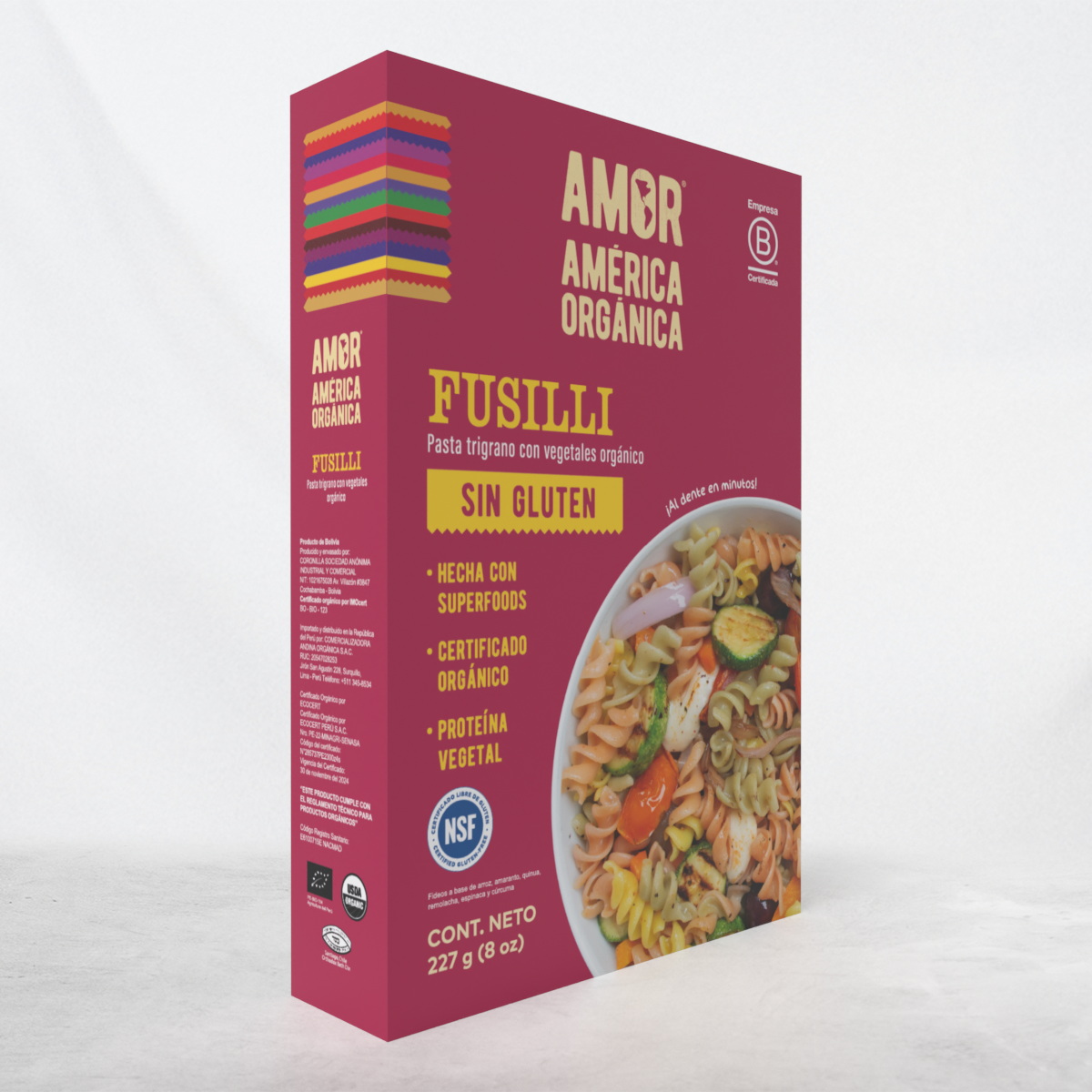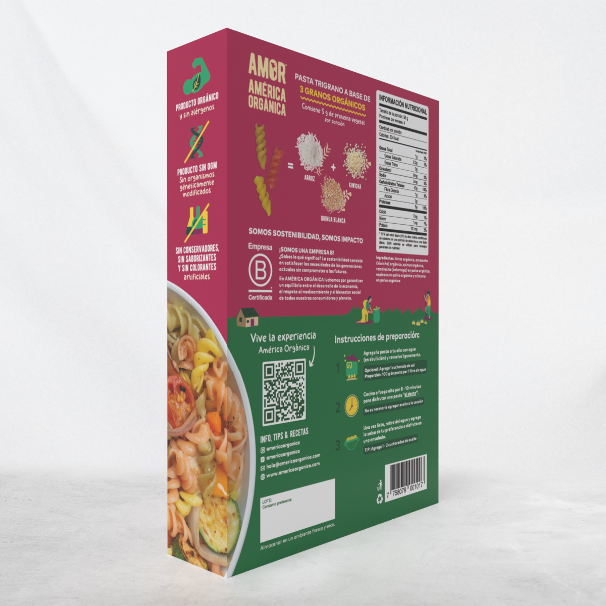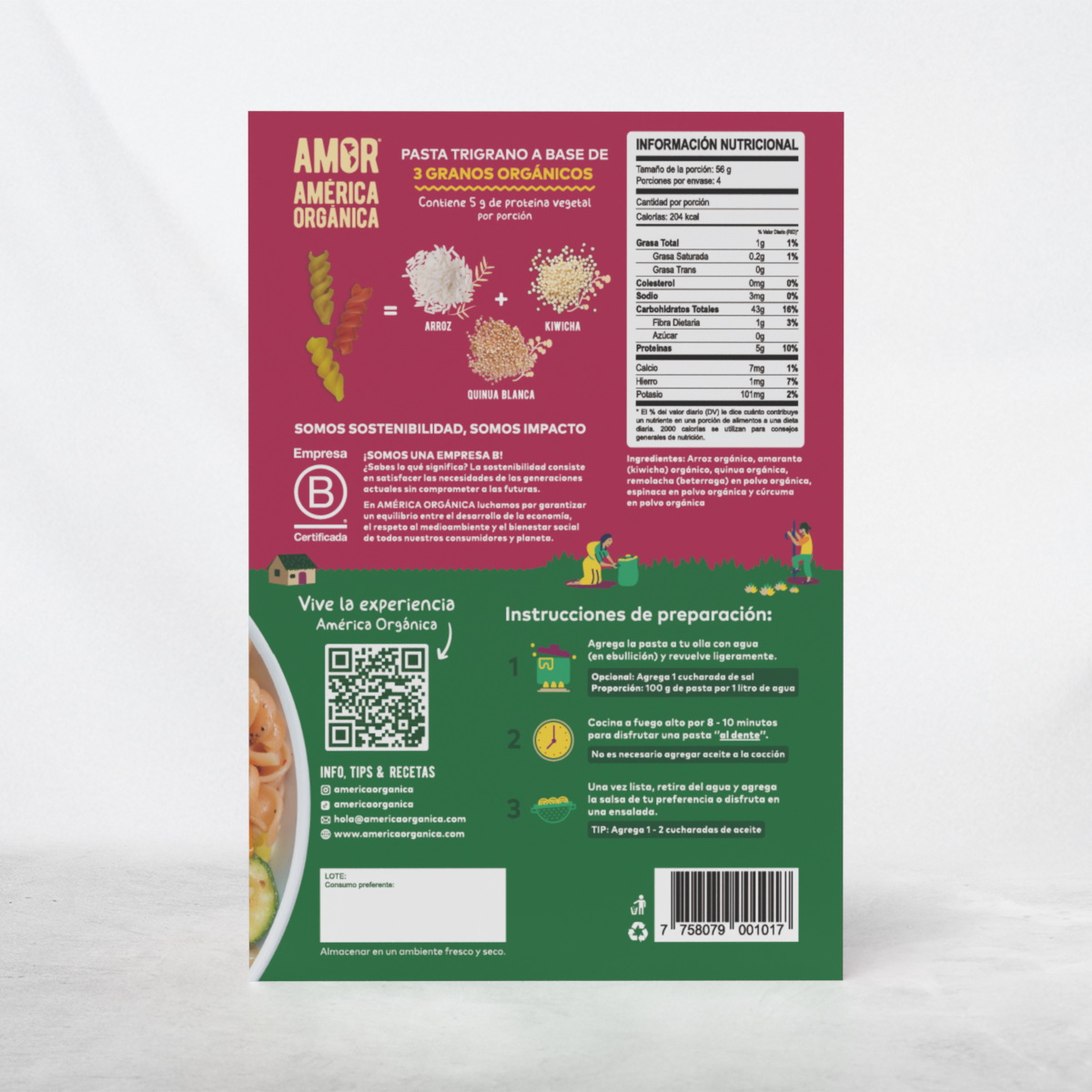 Pasta Trigrano tipo Fusilli Orgánica sin Gluten de América Orgánica hecha a base de arroz, quinua y kiwicha amaranto orgánicos, con espinaca, cúrcuma y remolacha en polvo. Modo de uso: Alimento.