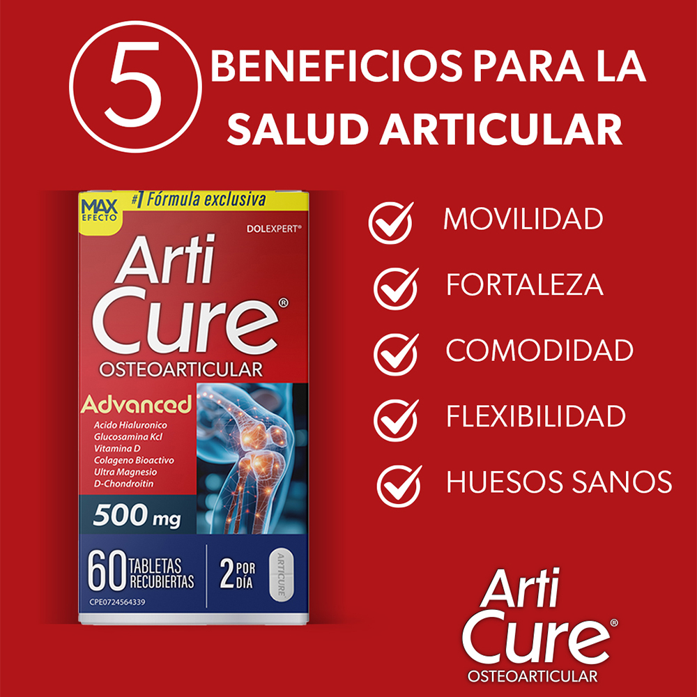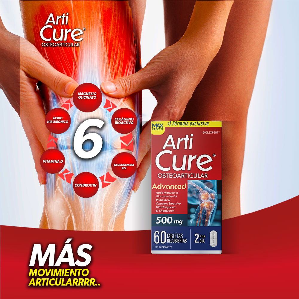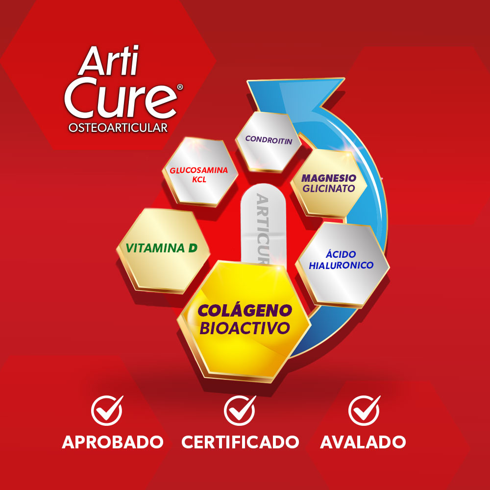 Articure es tu aliado para la salud articular. Su fórmula exclusiva combina colágeno bioactivo, magnesio, ácido hialurónico y vitamina D para mejorar movilidad, flexibilidad y bienestar diario Articure es un suplemento para el cuidado osteoarticular, con una combinación de colágeno bioactivo, ácido hialurónico, glucosamina, condroitina, magnesio glicinato y vitamina D, enfocados en mejorar la movilidad, flexibilidad de las articulaci Modo de uso 2 tabletas al día, preferiblemente una en la maana y otra en la noche, o según indicación del especialista.