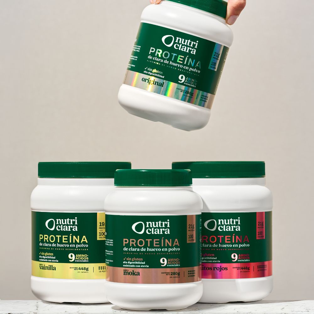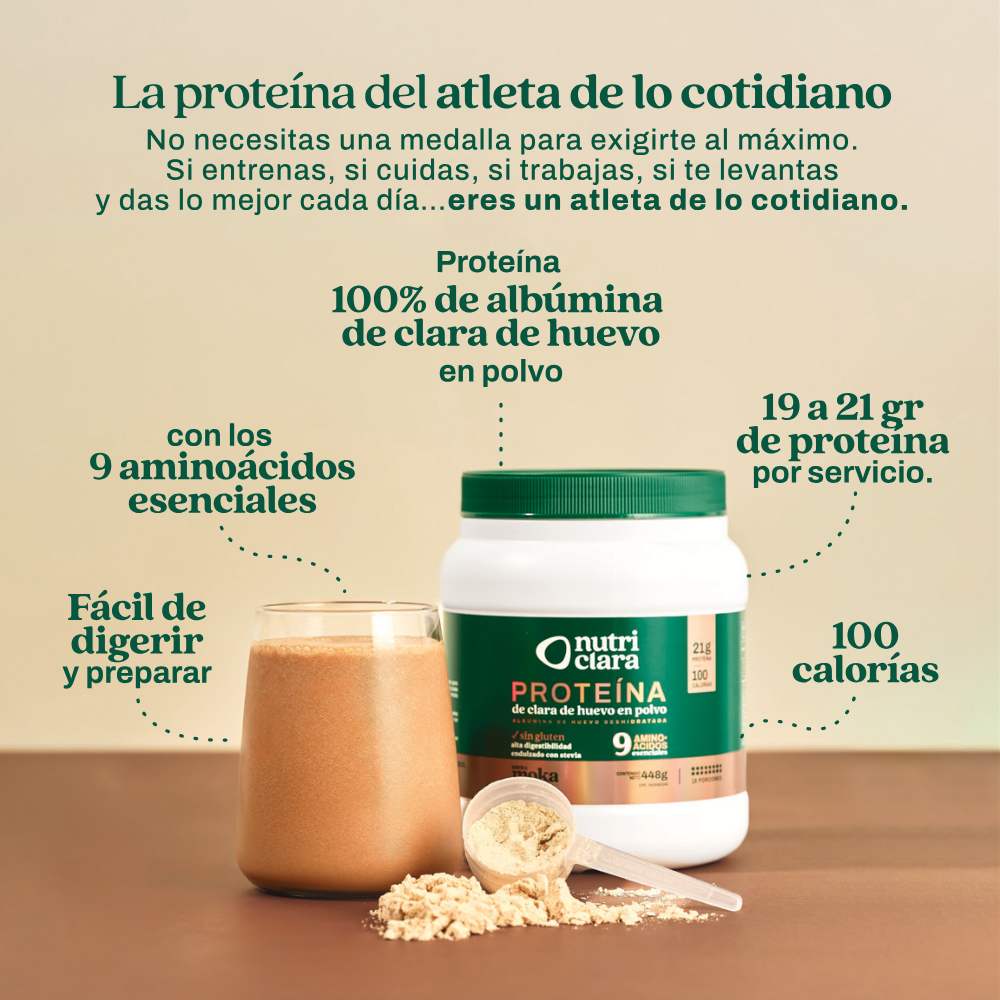 Proteína de albúmina de clara de huevo que te provee los 9 aminoácidos esenciales y saciedad prolongada Con alrededor de 21 g de proteína de albúmina de clara de huevo por cada servicio dos scoops que te provee los 9 aminoácidos esenciales y saciedad prolongada Modo de uso Mezcla dos scoop que equivalen a 28 gramos de Nutrí Clara que contienen 21 gramos de proteína con 250 ml de agua, o cualquier tipo de leche. Agitar bien hasta obtener una textura uniforme