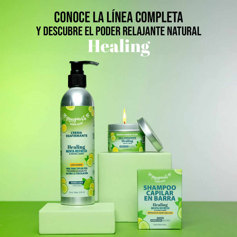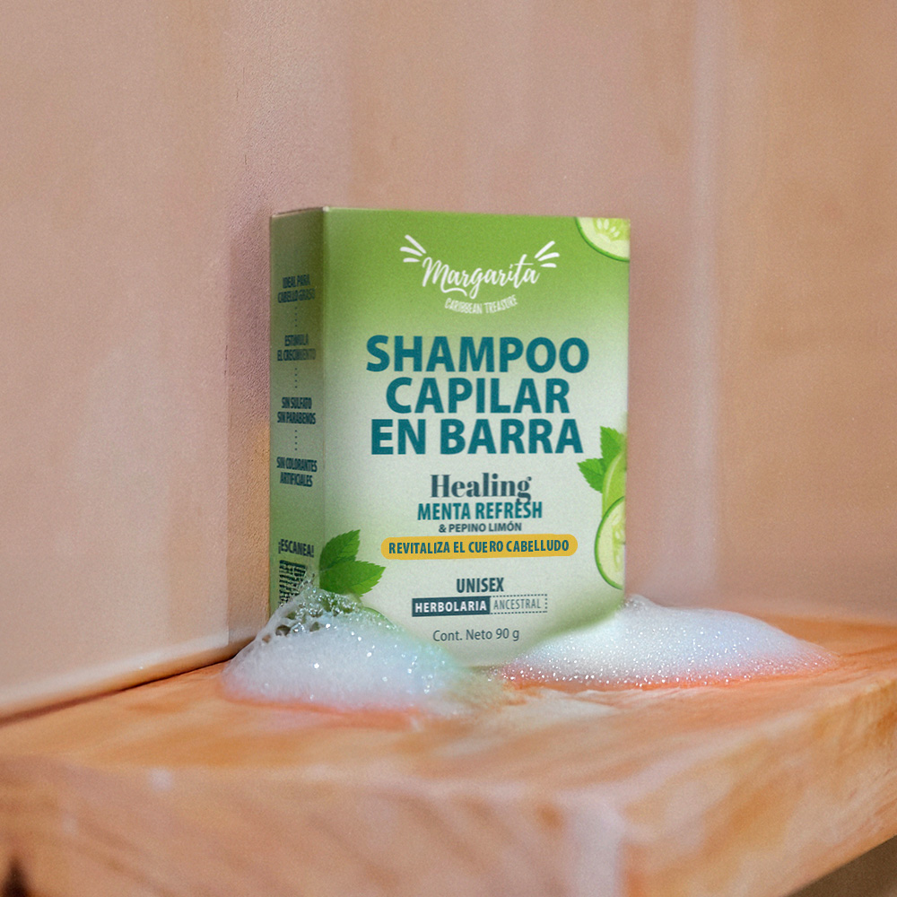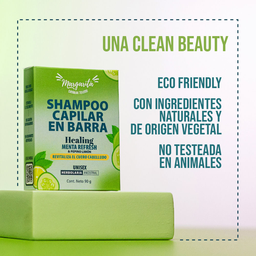 Shampoo Capilar en Barra Healing, Menta Refresh y Pepino Limón. Revitaliza el cuero cabelludo. Contiene carbón activado, aceite de jojoba, té verde y romero. Ideal para cabello graso.