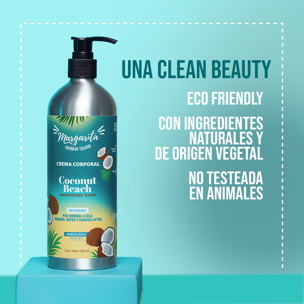 Crema Corporal Coconut Beach , textura ligera. Hidratación y humectación profunda. Mejora la elasticidad. Deja un efecto aterciopelado en la piel. Sin siliconas, sin parabenos y sin aceites minerales. Herbolaria Ancestral. Modo de uso: Uso diario para piel normal a seca.