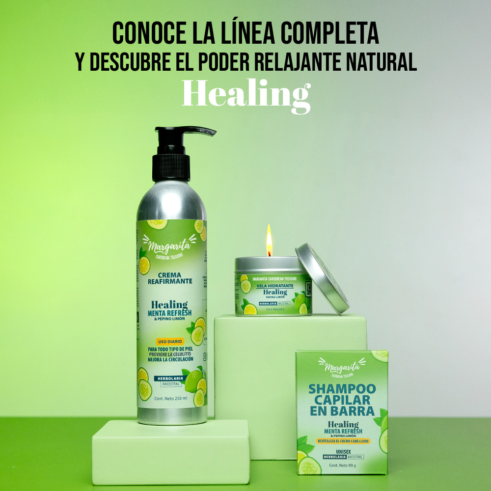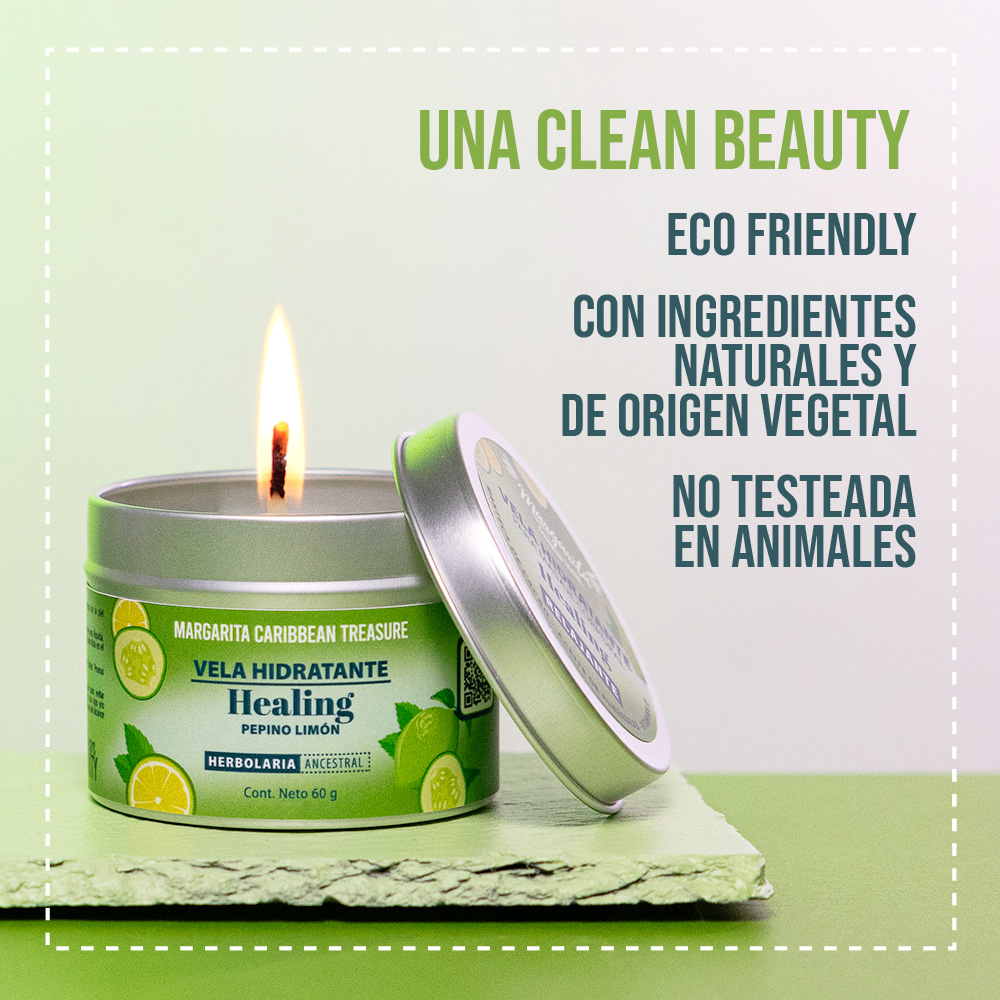 Vela Hidratante para Masaje Corporal Healing. La cera tibia penetra fácilmente los poros de la piel aumentando su hidratación. Contiene manteca de cacao, aceite de almendras y vitamina E. Aroma a pepino limón irresistible. Herbolaria Ancestral. Modo de uso: Uso diario para todo tipo de piel.