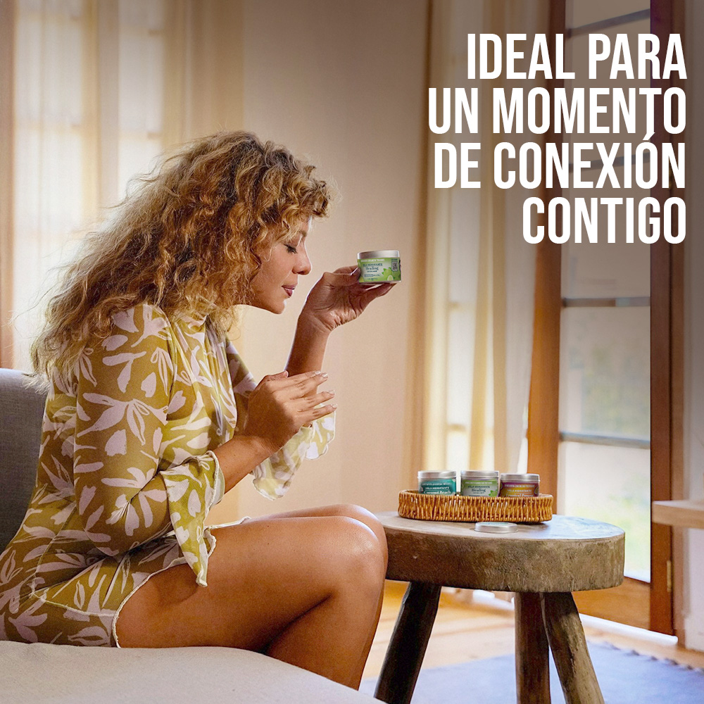 Integrada por la crema reafirmante, el shampoo en barra y la vela hidratante para masaje corporal.
