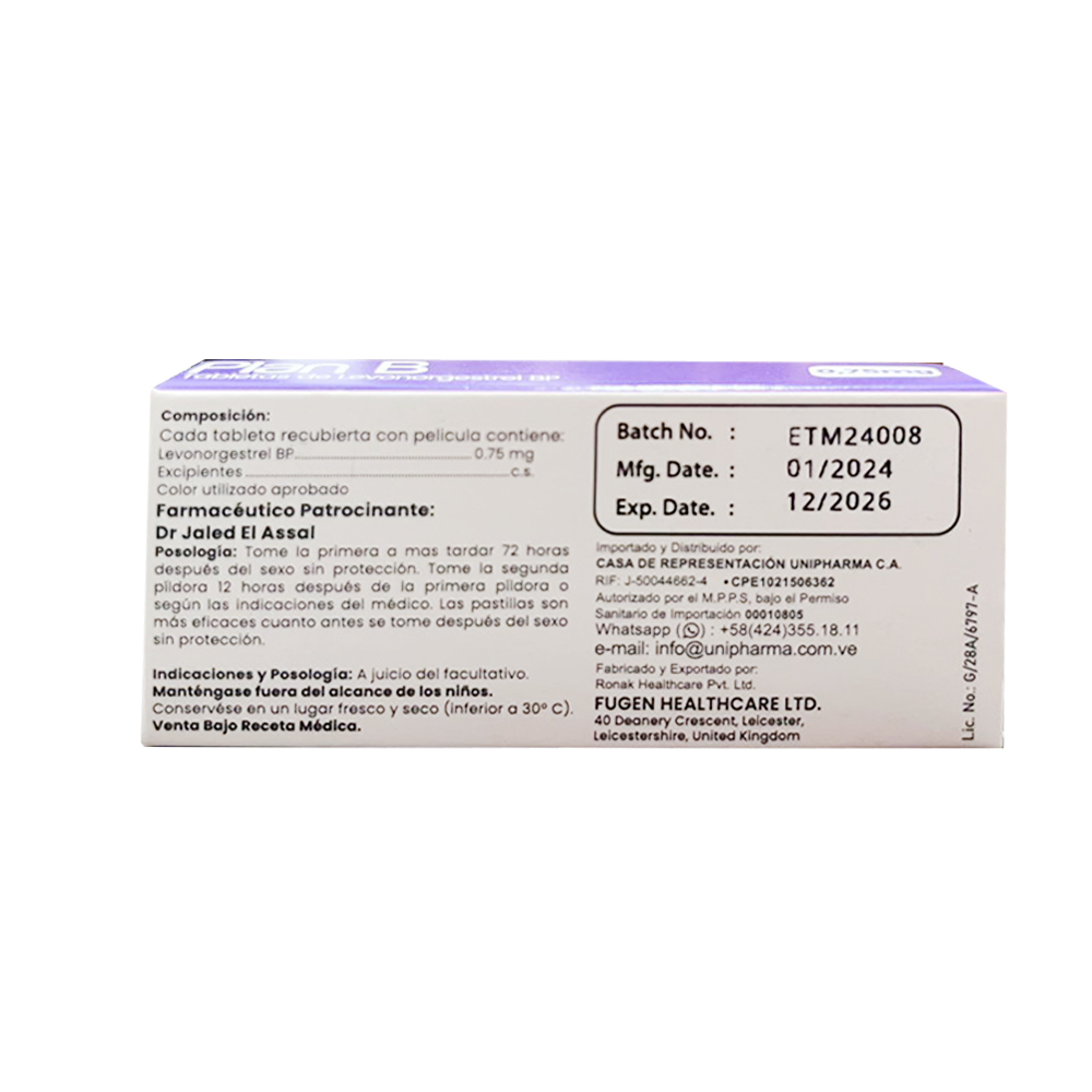 Plan B ES Levonorgestrel, UN efectivo Anticonceptivo DE Emergencia Que Para LA Prevención Del Embarazo Después DE Una Relación Sexual Sin Protección. Plan B ES Levonorgestrel 0,75MG X 2 Tabletas. Efectivo Anticonceptivo DE Emergencia Que Para LA Prevención Del Embarazo Después DE Una Relación Sexual Sin Protección. Modo de uso Los Anticonceptivos DE Emergencia SE Deben Dispensar Con Receta Médica. Las Pildoras Son Más Efectivas Cuanto Antes SE Tomen Despues DE Haber Tenido Relaciones Sexuales Sin Protección